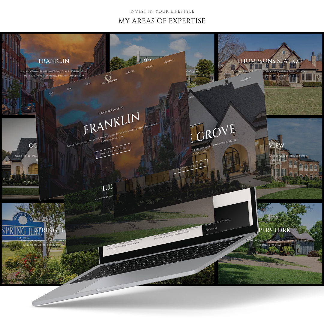 A polished platform that shares Sarah’s story, showcases properties, and highlights the lifestyle of her focus areas.